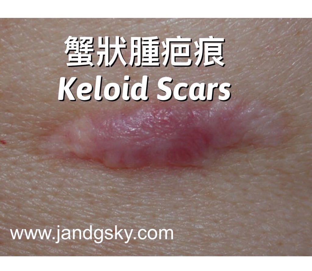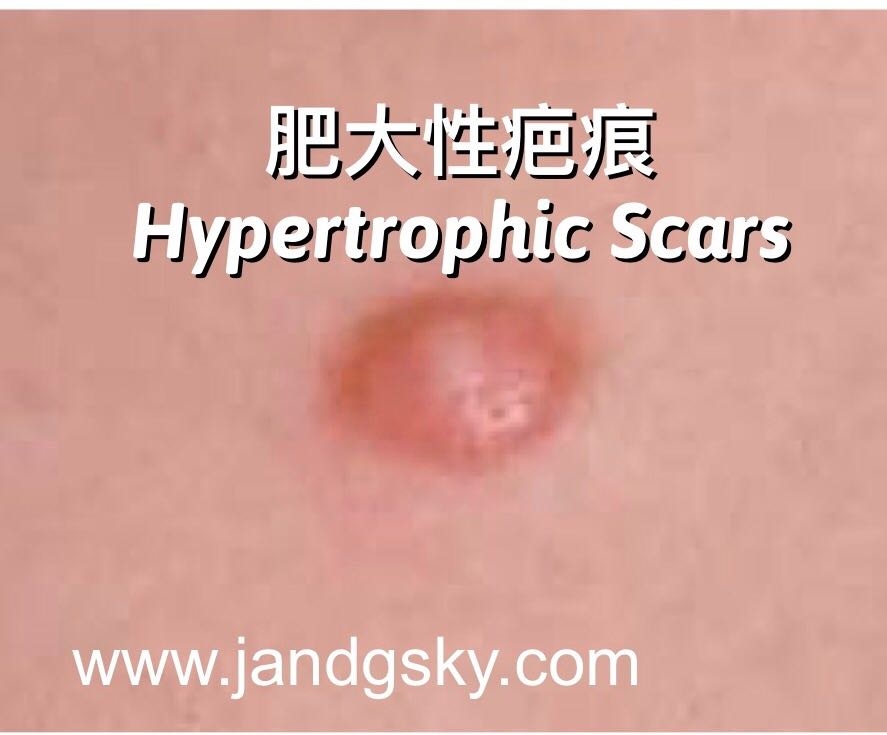 肥大性疤痕是紅色的,凸起的疤痕類似於蟹狀腫疤痕,但疤痕不會影響產生超越受損傷的邊界之外。