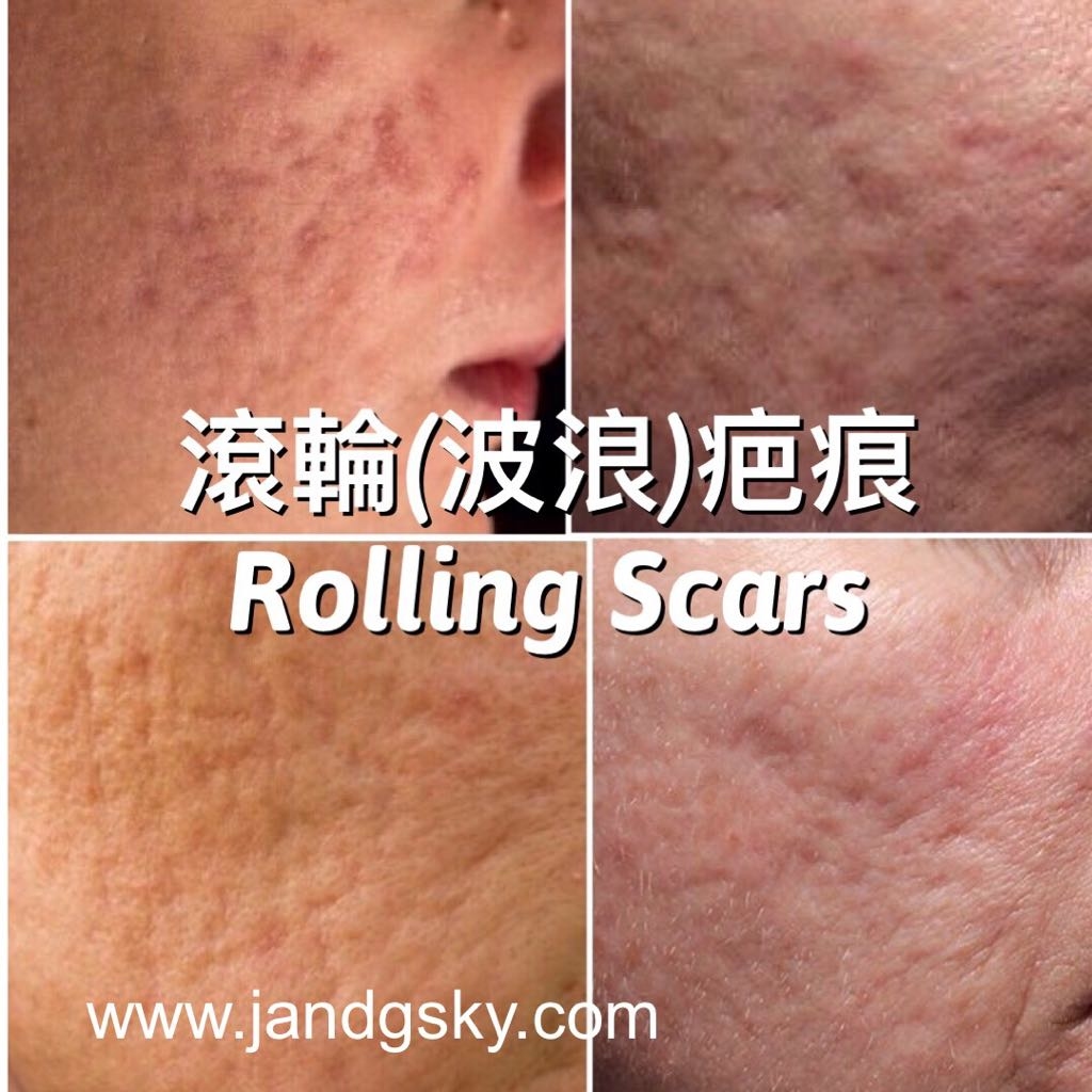 由於滾動疤痕具有傾斜邊緣,許多可用的疤痕治療技術能夠產生積極的結果。 激光換膚(燒蝕和非燒蝕),化學換膚,微磨皮,微針治療系統,皮下分離,甚至紅光光療可以改善滾輪(波浪)疤痕的外觀。