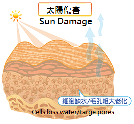 太陽傷害多年的陽光照射能夠使臉上的毛孔粗大。太陽的傷害實際上可能使皮膚變厚,從而造成臉部粗大的毛孔。長時間的陽光照射也可能會吸收膠原蛋白,彈性蛋白以及皮膚水分,使皮膚下方的組織收縮,從而拉扯毛孔邊緣,使其下垂並顯得更大。